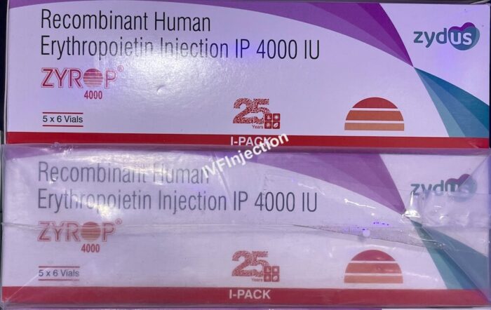 Zyrop 4000 Injection is a specialised injection used for increasing red blood cells in the bone marrow. The active ingredient is Recombinant human erythropoietin alfa 4000 IUs. Used widely to treat a type of anemia caused by kidney disease usually in patients with failed kidneys and are having regular dialysis. Zyrop 4000 is widely used to treat anemia caused by cancer chemotherapy. It boots red blood cells in the blood icnreasing oxygen carrying capacity.